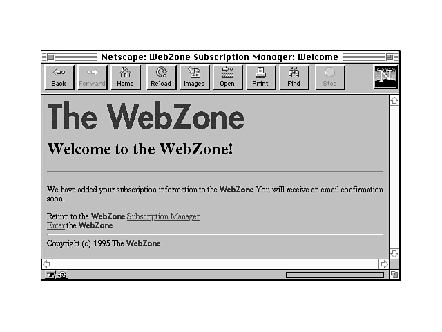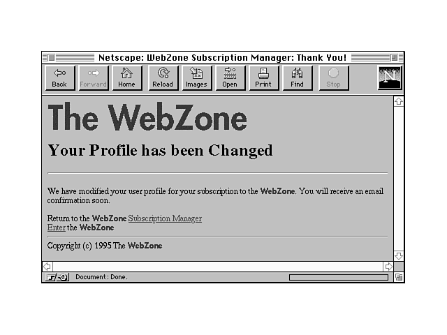 In order to accomplish this system of automatically customizing the magazine based on a stored user profile, WebZone has all its pages protected with access control. You must be a subscriber and be authenticated in order to access them. But becoming a subscriber simply involves filling out a form; it costs nothing, and your subscriber information is never sold to any vendors or greedy mailing list brokers.