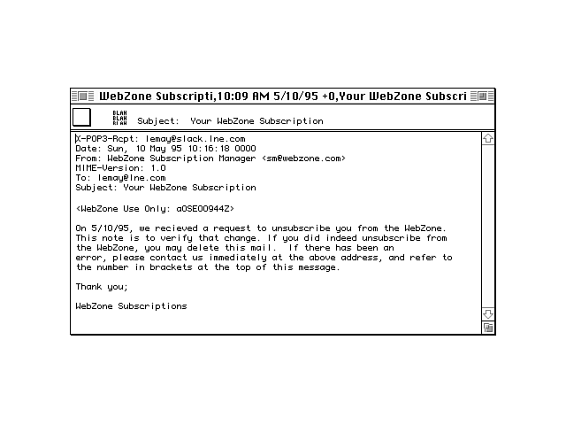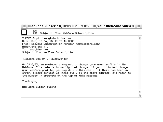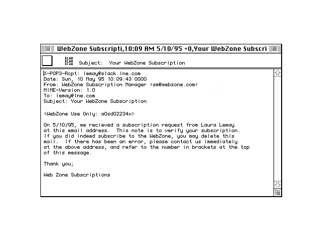Part of the verification process for making sure that you did indeed want to be subscribed to WebZone involves sending you mail (at the e-mail address you provided in the form). The verification e-mail is shown in Figure 22.16.