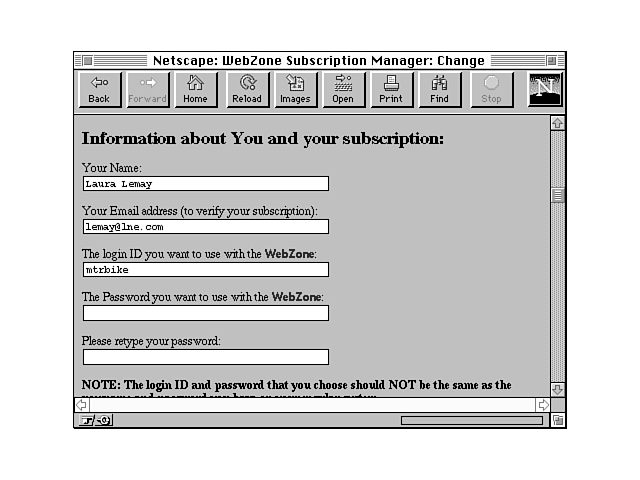 There are several parts of this form to fill out. The first part contains information about you and your subscription, such as your real name, your e-mail address, and the login ID and password you'll use to access WebZone in the future (see Figure 22.12).