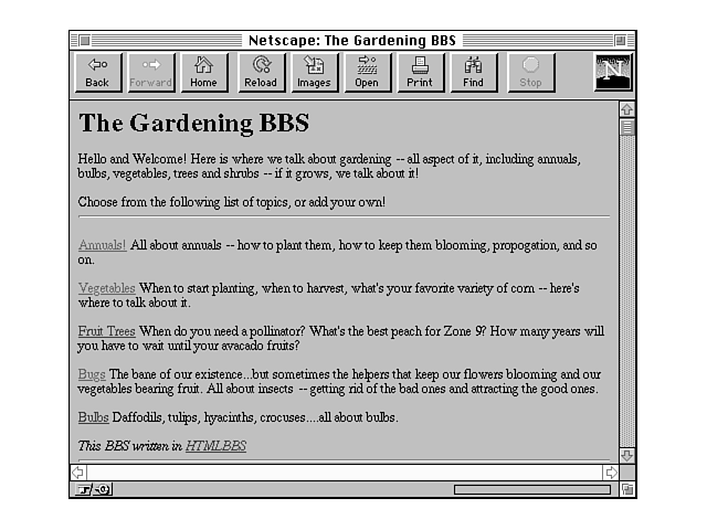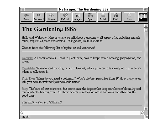 When you first enter the top level of the gardening BBS, you will get the page shown in Figure 22.24.