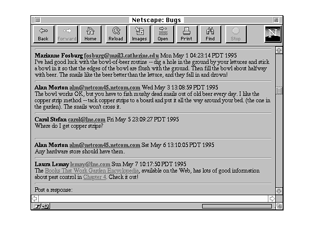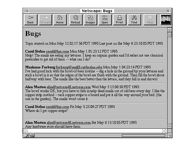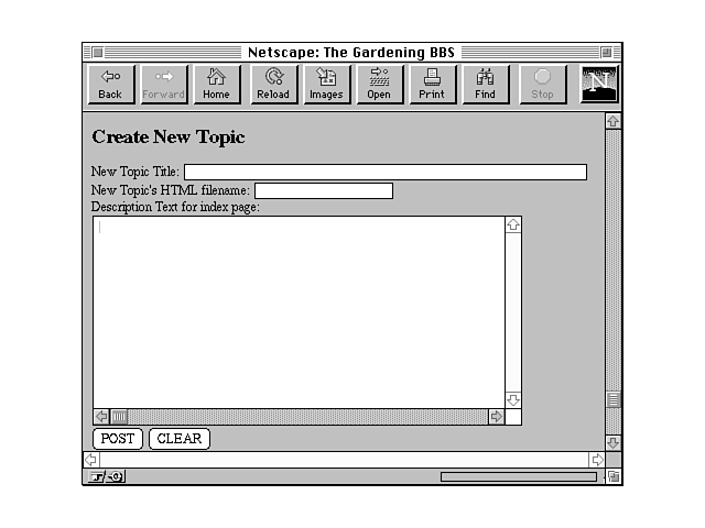 In this section, we'll look at a conferencing system that runs over the Web. This one is for a gardening BBS, in which the creator wants to foster communication about growing plants and trees and anything else that grows.