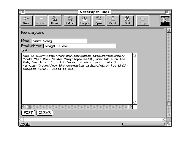 Type in your name and address (which mark the top of each post) and the content of the post itself. You can include HTML in the body of the posting, including character tags, links and anchors, and images (as long as the SRC attribute points to a full URL). For example, Figure 22.27 shows a posting I'm about to make to the Bugs topic, referring to another site that has information about snails.