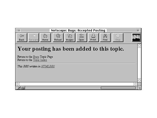 The HTML BBS system also has methods for creating new conferences, which are new directories with blank index files so that you can start a whole new BBS. You can have multiple directories containing multiple topics for any major subject you might want to deal with.