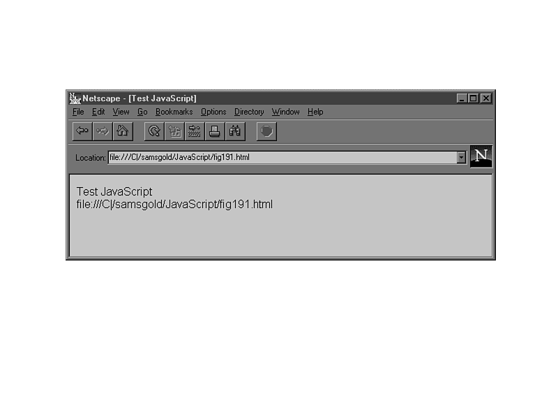 <HTML> <HEAD> <TITLE>Test JavaScript</TITLE> <SCRIPT LANGUAGE="JavaScript"> <! hide from old browsers document.write(document.title + "<BR>"); document.write(location.toString()); // done hiding > </SCRIPT> </HEAD> </HTML>