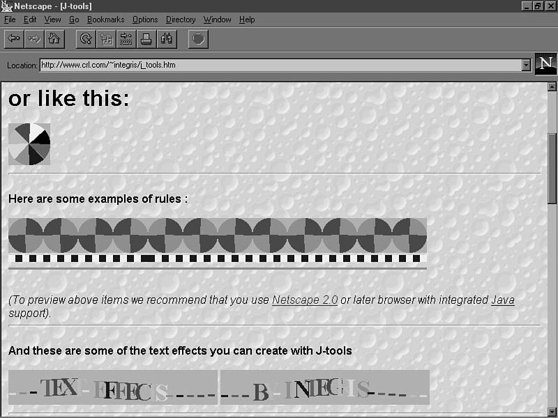 A quick exploration of the Gamelan site will reveal other sites that also offer classes you can incorporate into your own Web pages. Take, for example, the J_tools site shown in Figure 25.7. This collection includes applets that display animated bullets, multicolored wavy text, and different types of horizontal rules. To find out more about how you can use these applets in your own pages, take a look at http://www.crl.com/~integris/j_tools.htm.