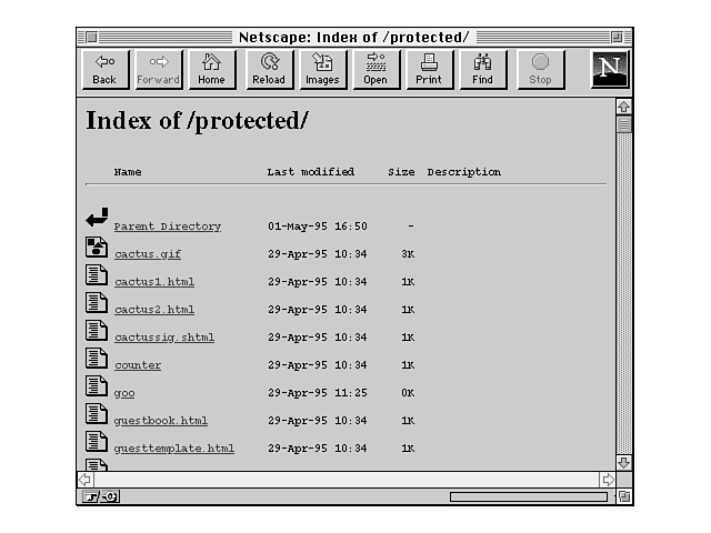 Again, most servers are set up so that if a user requests a URL that ends in a directory, a default filename (usually index.html) is appended to that URL. But what if the directory doesn't contain a file called index.html? Usually the server will send a listing of the files in that directory, in much the same way that you get a listing for files in an FTP directory (see Figure 28.1).
