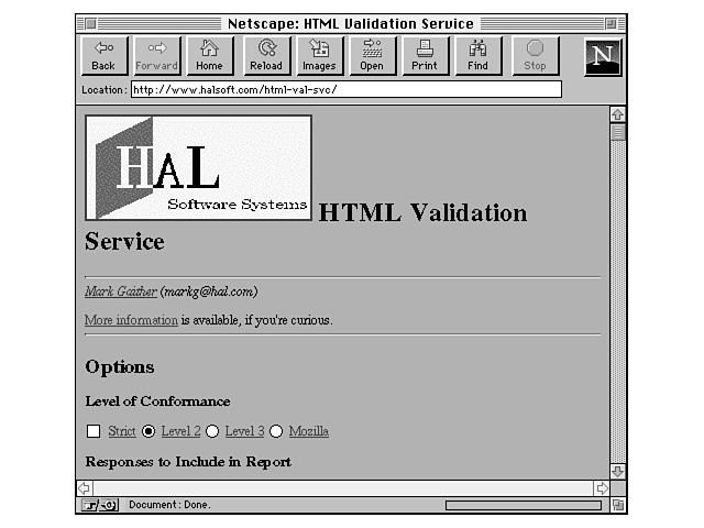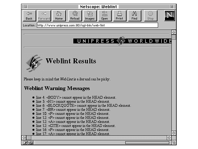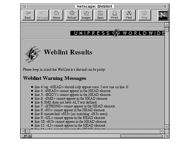 The Weblint program is a more general HTML checker. In addition to making sure your syntax is correct, it also checks for some of the more common mistakes: mismatched closing tags, putting TITLE outside of HEAD, multiple elements that should appear only once, and points out other hints (have you included ALT text in your <IMG> tags?). Its output is considerably friendlier than the HTML validator, but it is less picky about true HTML compliance (and, in fact, it might complain about more recent tags such as tables and other HTML additions).