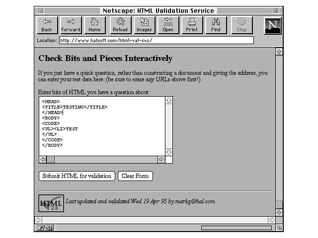 So how do you run these HTML validators? Several are available on the Web, either for downloading and running locally on your own system, or as Web pages in which you can enter your URLs into a form, and the validator tests them over the network. I like two in particular: WebTech's HTML validation service, and Neil Browsers' Weblint.