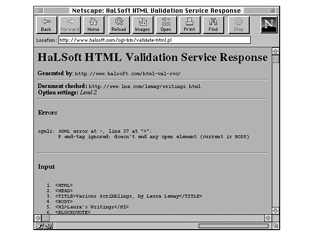 Your HTML page is tested against an SGML parser and the current HTML definition for the level you choose; any errors found are reported (an example is shown in Figure 29.3). If you selected Show Input in the original form, your HTML code with line numbers is also included in the output, which is useful for finding the errors that the validator is complaining about.