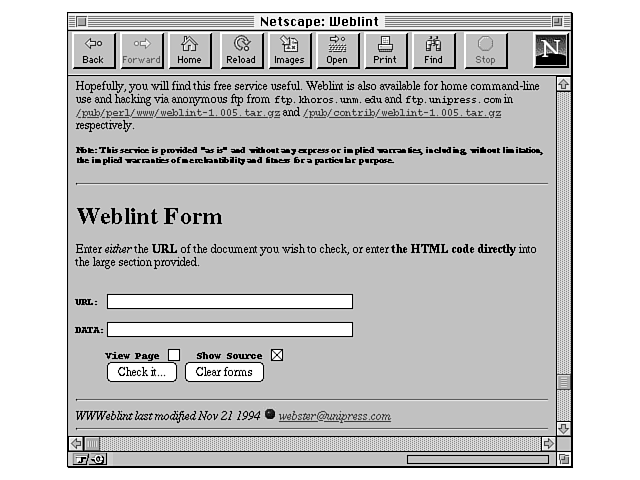 If you'd rather use Weblint on your own system, you can get the code (written in Perl) at ftp://ftp.unipress.com/pub/contrib/weblint-1.005.tar.gz.
