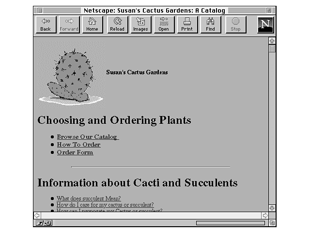 <HTML> <HEAD> <TITLE>Susan's Cactus Gardens: A Catalog</TITLE> <HEAD> <BODY> <IMG SRC="cactus.gif" ALIGN=MIDDLE> <STRONG>Susan's Cactus Gardens</STRONG> <H1>Choosing and Ordering Plants</H3> <UL> <H3> <LI><A HREF="browse.html">Browse Our Catalog <LI><A HREF="order.html>How To Order</A> <LI><A HREF="form.html">Order Form</A> </UL> </H3> <HR WIDTH=70% ALIGN=CENTER> <H1>Information about Cacti and Succulents</H1> <UL> <LI><A HREF="succulent.html">What does succulent Mean?</A> <LI><A HREF="caring.html">How do I care for my cactus or succulent?</A> <LI><A HREF="propogation.html">How can I propagate my Cactus or succulent?</A> </UL> <HR> <ADDRESS>Copyright © 1994 Susan's Cactus Gardens susan@catus.com</ADDRESS>