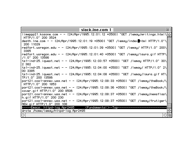 Another method of usability testing your documents after they've been published on the Web is to keep track of your server logs, which you learned about in Chapter 27, "Web Server Hints, Tricks, and Tips." Your Web server or provider keeps logs of each hit on your page (each time a browser retrieves that document), and where it came from (see Figure 29.9). Examining your Web logs can teach you several things: