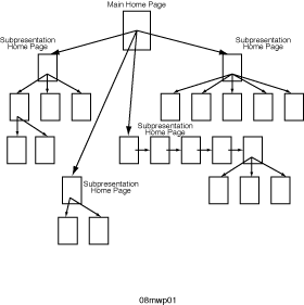 Each subpresentation can have its own tree of pages, its own home page, and sometimes even its own site and server. By extension, you can have different people working on different subpresentations without worrying that their work will conflict or overlap with someone else's work in the larger tree. You, as the Webmaster or team leader, can then focus on the bigger picture of how the bigger presentation fits together.