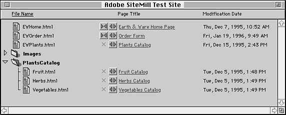 Adobe SiteMill is the larger and more fully featured version of Adobe PageMill for the Macintosh. Whereas PageMill was used to create individual pages, SiteMill includes a tool for keeping track of links between pages in the presentation and automatically checking the validly of and fixing those links. Figure 30.3 shows the site view window in Adobe SiteMill.