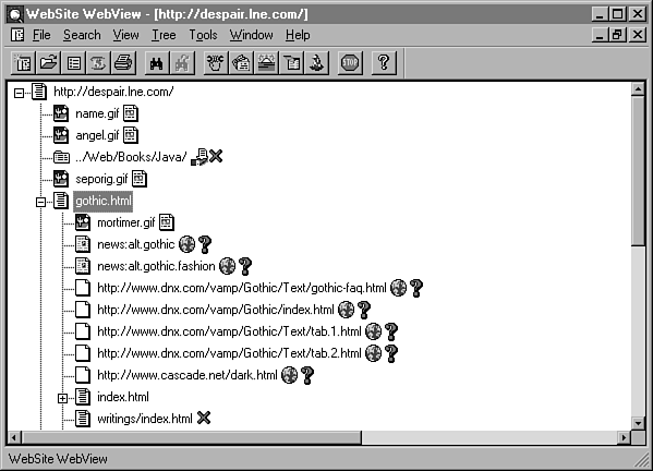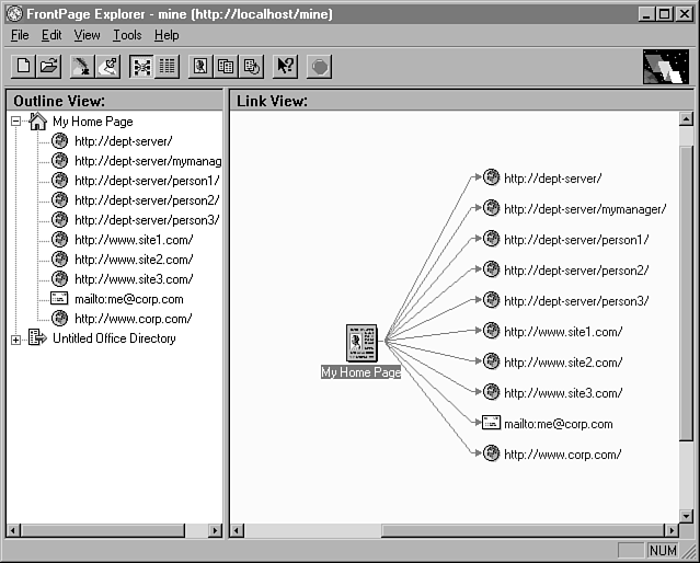 FrontPage, which you learned about in Chapter 6, "HTML Assistants: Editors and Converters," also has integrated site creation and management capabilities, including the ability to include search engines, guestbooks, navigation bars, BBS-like discussion groups, and so on. For link management, it has a Site Explorer, which presents the site in a form similar to the Windows 95 Explorer (see Figure 30.4). FrontPage also includes its own simple Web server, thereby covering just about all sides of the process. Find out more about FrontPage at http://www.microsoft.com/frontpage/.