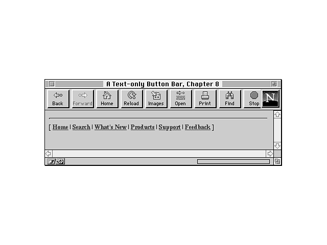 Button bars are rows of text or image links that point to specific places on your server (no, a text-only button bar is not an oxymoron). They're different from ordinary navigation icons in that they don't provide instructions for specific types of movement from the current page (up, back, next), but they provide shortcuts to the most important parts of your site. Think of button bars as a quick-reference card for your overall presentation.