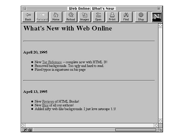 A typical What's New page (such as the one in Figure 30.11) contains a list of links to pages that are new in the presentation (or pages that have new information), with a short description of what the page contains, sorted by how new they are (with the newest parts first). This way your readers can quickly scan the new stuff, visit the pages they are interested in, and move on. By placing the newest information first, your readers don't have to wait for the whole page to load or have to scroll to the bottom to get the new information.