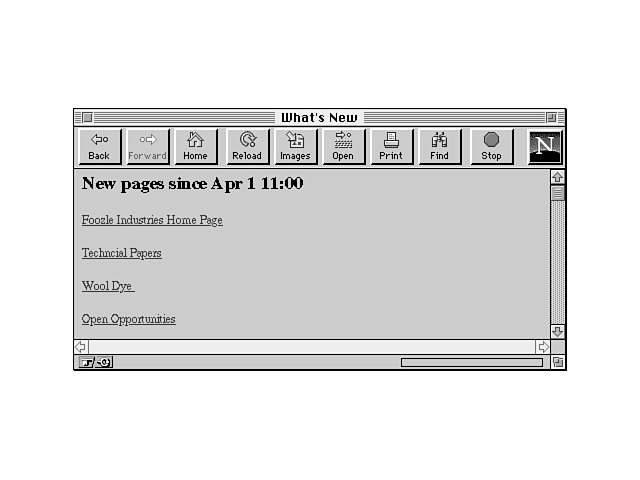 How do you create a What's New page? You can do one by hand by writing down information about changes you make to the presentation as you make them. You can also use our whatsnew script, available from http://www.lne.com/Web/Source/mkwhatsnew.txt, a Perl script that searches a tree of directories, finds files that are newer than a certain date, and returns a list of links to those files (as shown in Figure 30.12).