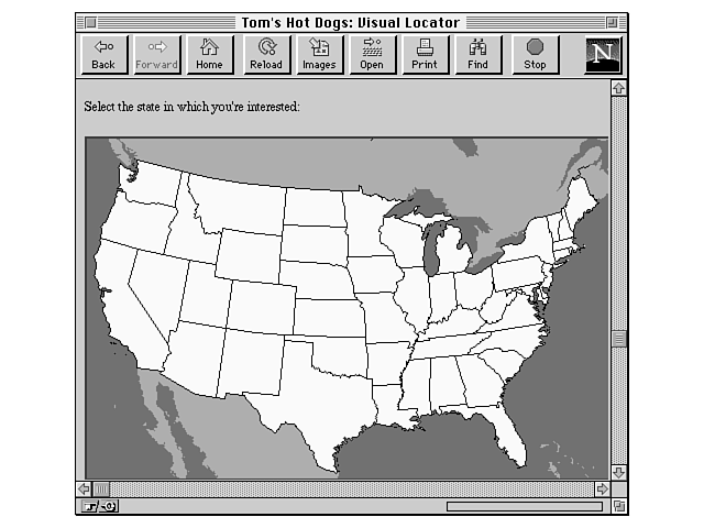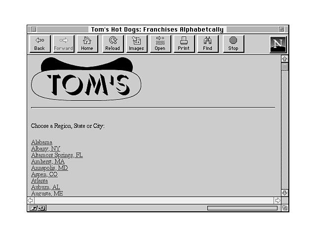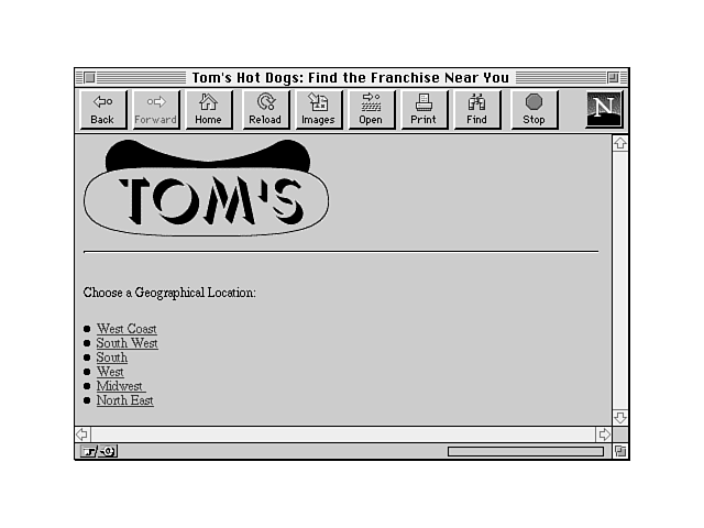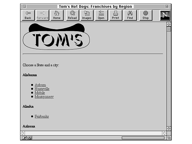 For example, suppose you have a presentation that describes all the locations of the Tom's Hot Dog franchises in the United States, with a separate page for each separate location (its address, management team, special features, and so on). How will people find a franchise in their area? Your main structure is a hierarchy, with the presentation organized by region and by state. You could provide a view that mirrors the organization with link menus for the regions, which point to link menus for the states, cities, and eventually individual stores. Figure 30.13 shows how the topmost menu might look.