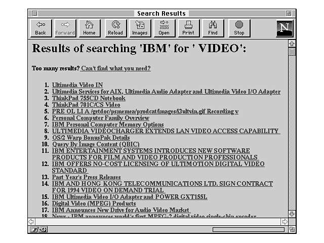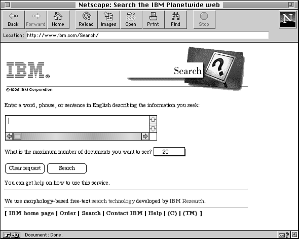For really large presentations in which information is widely distributed among the pages, sometimes the best way to let people find what they want is to let them tell you what they want. Search engines are used to add searching capabilities to your pages so that your users can enter the keywords of things they're looking for and get a list of pages that contain those keywords (and, hopefully, links to those pages). For example, Figure 30.17 shows the search form from IBM's Web site (http://www.ibm.com), and Figure 30.18 shows the results.