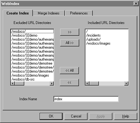 If you're adept at programming and CGI, you can write your own search engine to search the contents of your server and the pages on it and to return a list of links to those pages. If you have an enormous amount of information, you might want to check out a document indexing and retrieval system such as freeWAIS-sf (http://ls6-www.informatik.uni-dortmund.de/freeWAIS-sf/README-sf), Harvest (http://harvest.cs.colorado.edu/), or Glimpse (http://glimpse.cs.arizona.edu:1994/). Also, there are commercial search engines you can buy (such as WebSearcher from Verity, which has enormous capabilities for indexing and searching) that will index your server and provide a front end to the information you have there. Your Web server may even contain its own search engine with which you can index your document. (Figure 30.19 shows the indexing window for WebSite's integrated search engine.) Which search engine you use isn't as important as making sure that it allows your readers to get what they want without waiting too long for that information. Once again, making sure you satisfy your audience and their goals for your pages is more important than having the most sophisticated technology.
