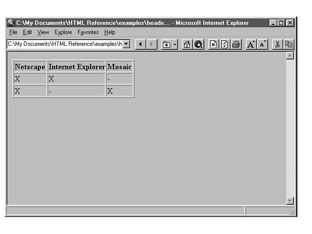 <TABLE BORDER> <TR> <TH>Netscape</TH><TH>Internet Explorer</TH><TH>Mosaic</TH> </TR> <TR> <TD>X</TD><TD>X</TD><TD>-</TD> </TR> <TR> <TD>X</TD><TD>-</TD><TD>X</TD> </TR> </TABLE>